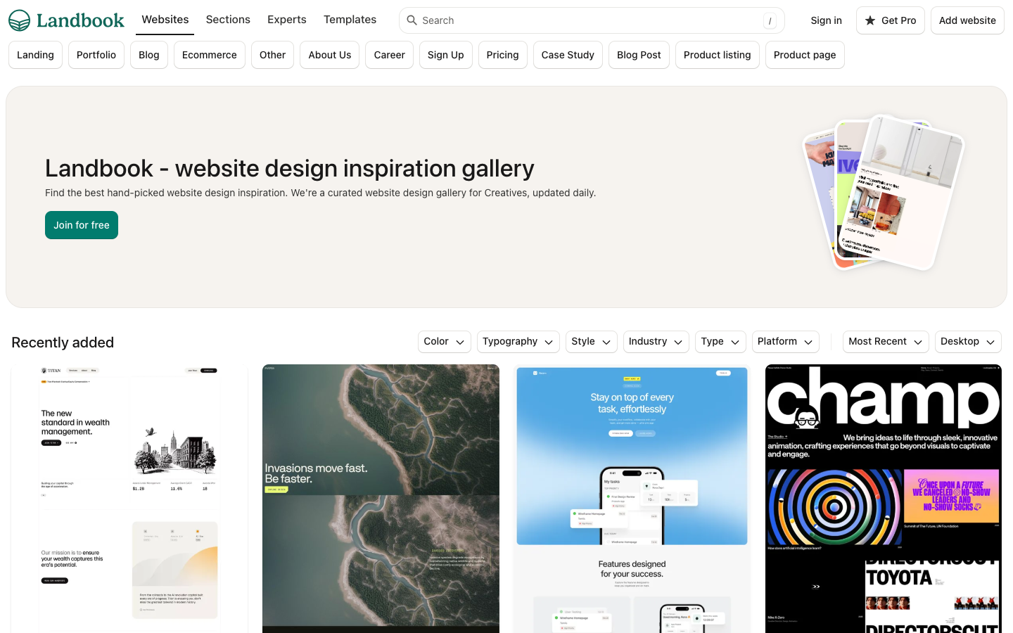 - Land-Book has the most advanced filtering system—filter by color, typography, style, industry, and platform.