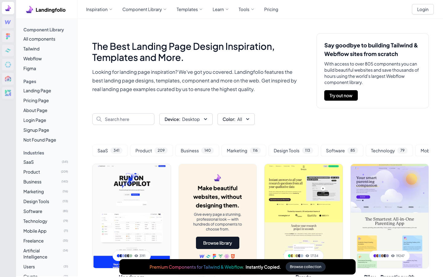 The gallery includes 961+ landing page examples across 54+ categories, filterable by industry (SaaS, tech, e-commerce), page type (homepage, pricing, features), and design style. But what moves Landing Folio beyond a pure gallery is its component library: 4,650+ UI components with 805+ offering instant copy-paste support for Tailwind CSS, Webflow, and Figma.