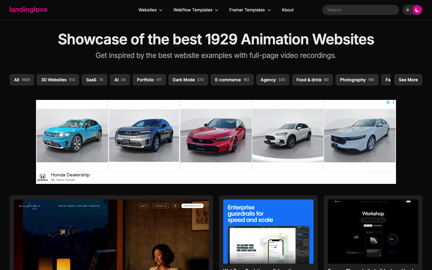 Most design galleries show you a static screenshot. Landing Love records the entire page experience on video—scroll animations, hover states, page transitions, loading sequences. This makes it the best resource for studying how motion and interaction design actually work in production.