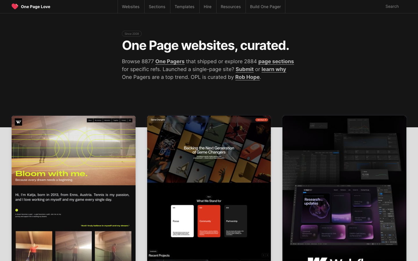 One Page Love has been curating single-page websites since 2008, making it one of the longest-running design inspiration sites on the web.