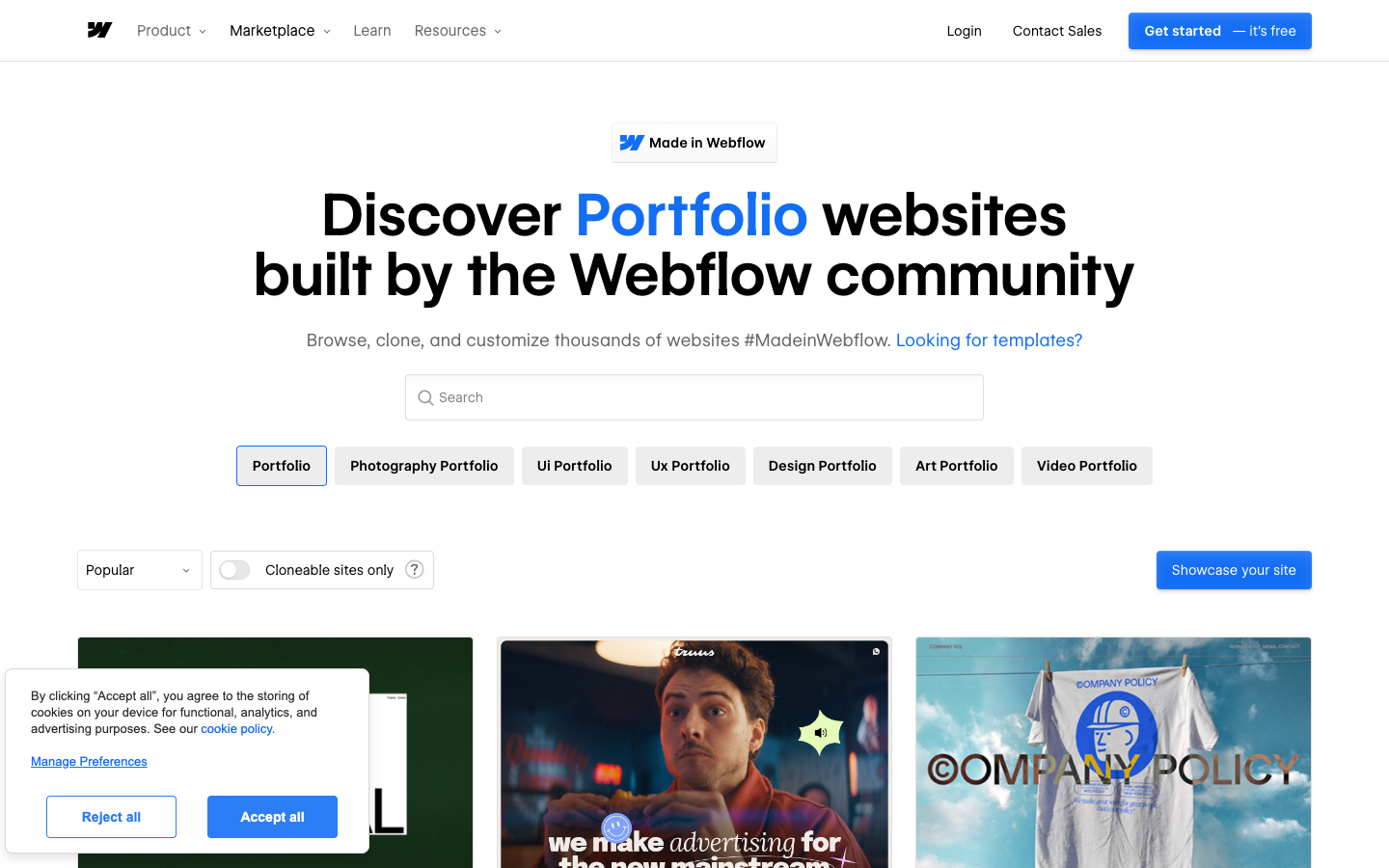 The Made in Webflow showcase features cloneable portfolio sites built by the community.
