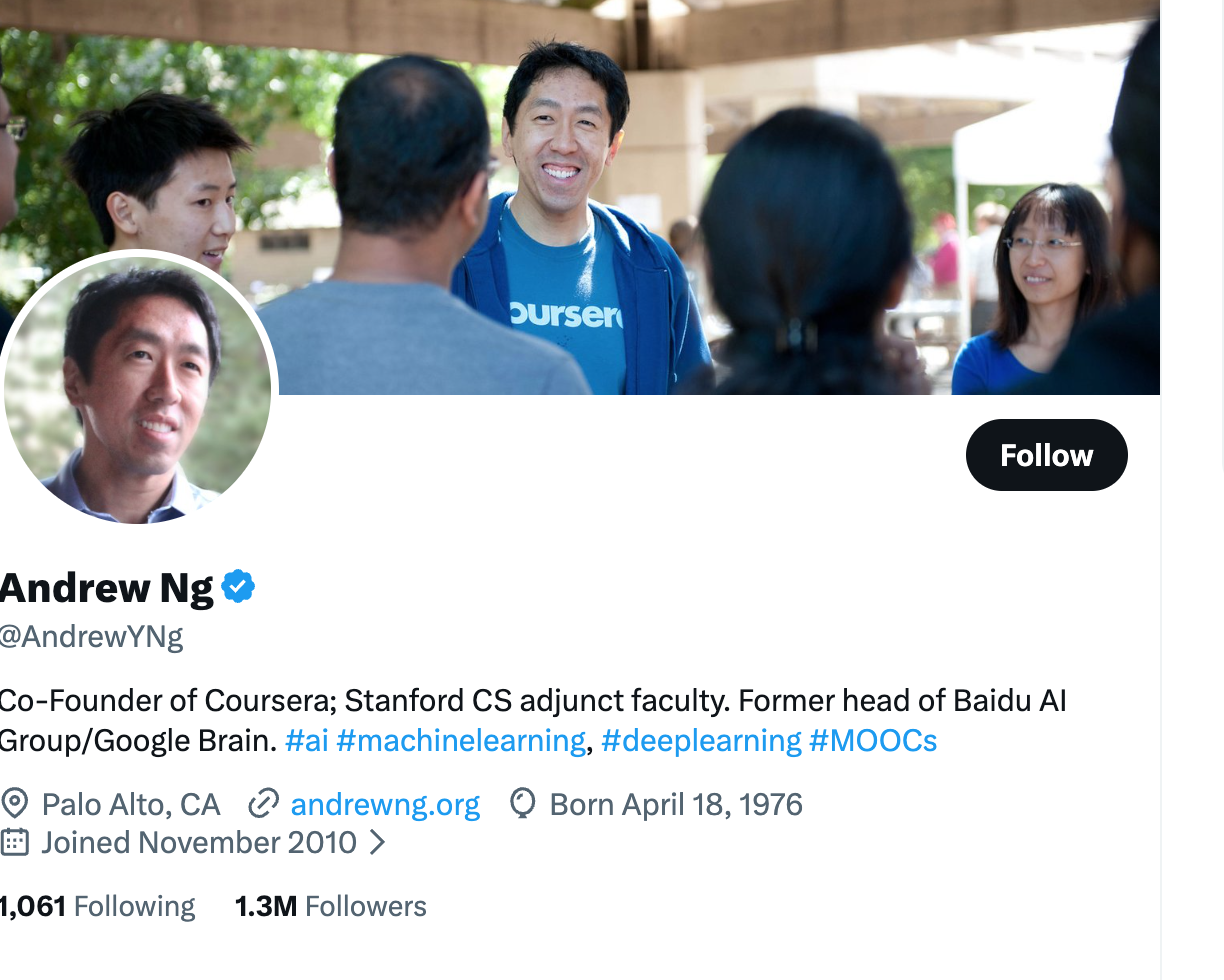 | Andrew Ng | @AndrewYNg | DeepLearning.AI founder |