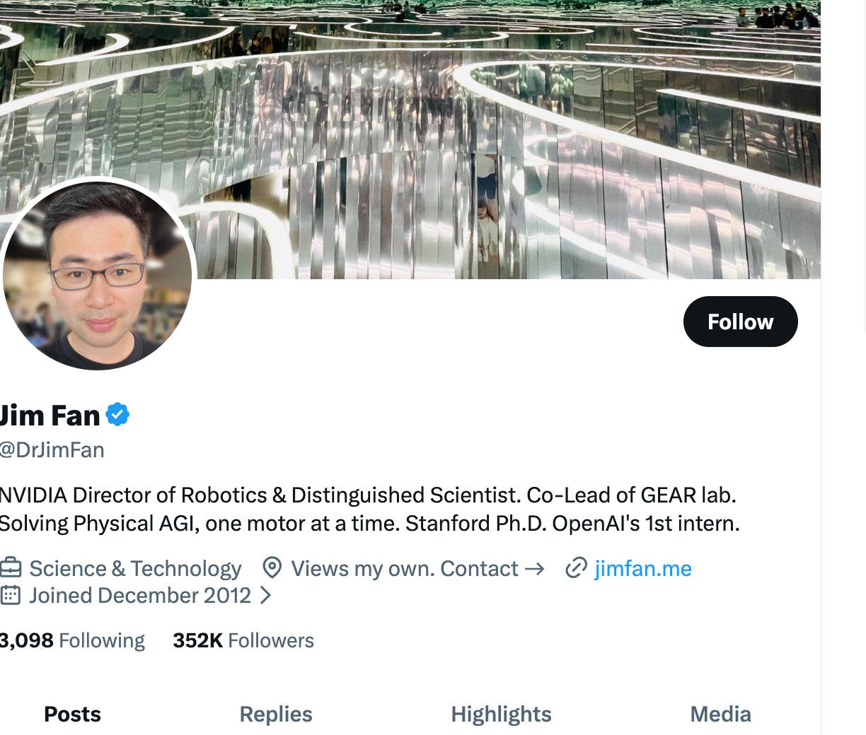 AI Research Scientist at NVIDIA. PhD from Stanford under Fei-Fei Li. His research focuses on generally capable autonomous agents—AI systems that can operate across different environments and tasks. Posts detailed threads on embodied AI, foundation models, and robotics.